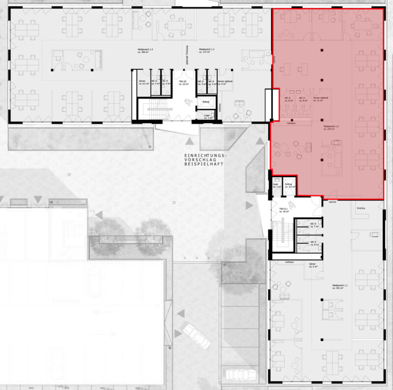 Im Bürogebäude 2 mit Ausrichtung zu "An den Loddenbüschen" steht zur Anmietung ab sofort eine Einheit von rund 363 m² im EG zur Verfügung. Ein Ausbau der Räumlichkeiten nach Ihren Wünschen und Bedarfen kann auf Wunsch vorgenommen werden. Ein Beispielausbau ist dargestellt. Die Einheit verfügt über eigene, getrennte Sanitäranlagen. Optional ist eine weitere Mieteinheit im 2. Obergeschoss des Bürogebäudes 1 mit Ausrichtung zum Albersloher Weg hin anmietbar. Der Campus wird als Digital Office ausgebaut, sodass die gesamte Gebäudetechnik an die persönliche Raumaufteilung und an die Bedürfnisse der Mieter ausgerichtet wird für eine effiziente und ressourcensparende Ausrichtung. Der Mieter kann jederzeit seine Verbräuche überwachen und Änderungen z.B. per App vornehmen.