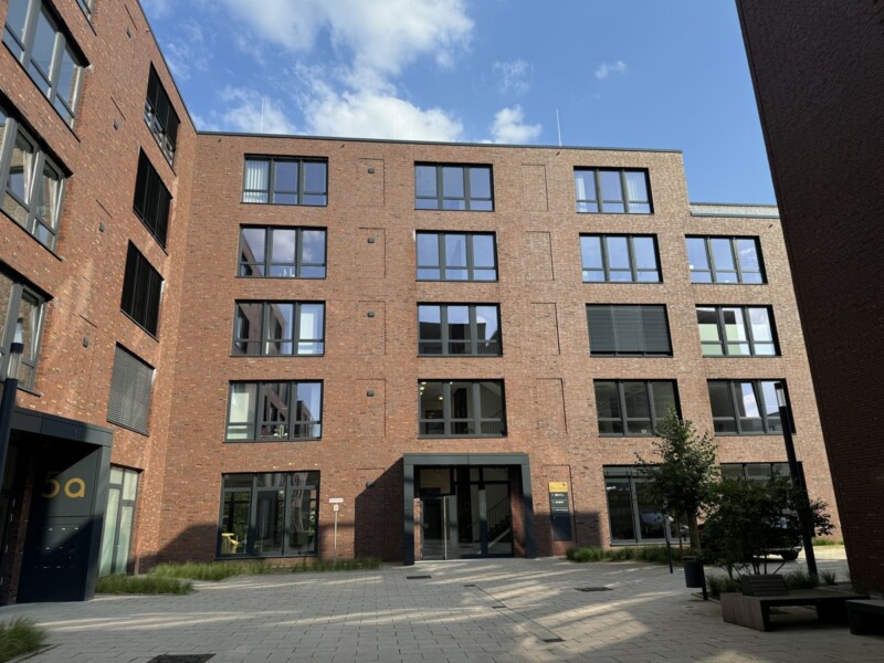 Der Campusbereich zwischen den beiden städtebaulich raffiniert angeordneten L-förmigen Bürogebäuden 1 (ca. 5.600 m² Mietfläche) und 2 (ca. 6.000 m²) mit jeweils eigenen Eingangsbereichen lädt mit seinen gestalteten und verkehrsberuhigten Freiflächen zu inspirierenden Kreativpausen ein.