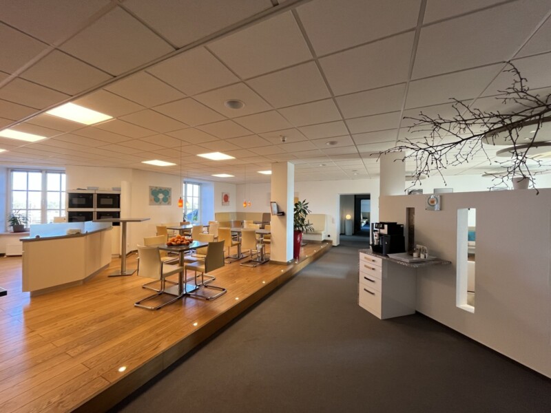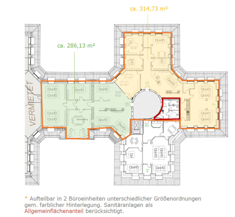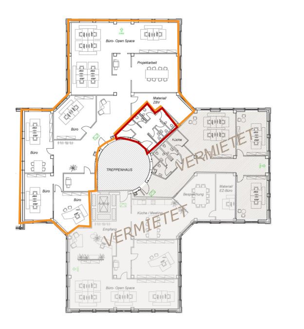 Eine Fläche mit ca. 361 m² befindet sich im Stern 4 im Obergeschoss und eine weitere ca. 600 m² große Fläche im Stern 3/4 im 1. Dachgeschoss (inkl. Allgemeinflächenanteil) . Die Büroflächen im Dachgeschoss sind teilbar in ca. 314 m² und ca. 286 m² große Einheiten.