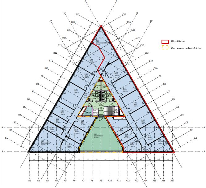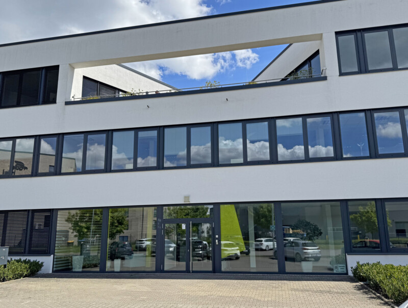 Zum 01.01.2026 wird im Technologiepark eine moderne Bürofläche mit insgesamt rund 444 m² zur Vermietung frei. Das 2016 errichtete Bürogebäude wird über einen repräsentativen Eingangsbereich mit Empfang und Wartebereich erschlossen. Hier befinden sich auch eine Cafeteria sowie Konferenzräume, die von allen Mietern gemeinsam genutzt werden können. Die Einheit liegt im 2. Obergeschoss und umfasst ca. 317 m² für Büronutzungen. Hinzu kommen rund 127 m² anteilige Allgemeinflächen, darunter Flure, WCs, Seminarbereich, Foyer, Dachterrasse sowie eine Teeküche im Obergeschoss.