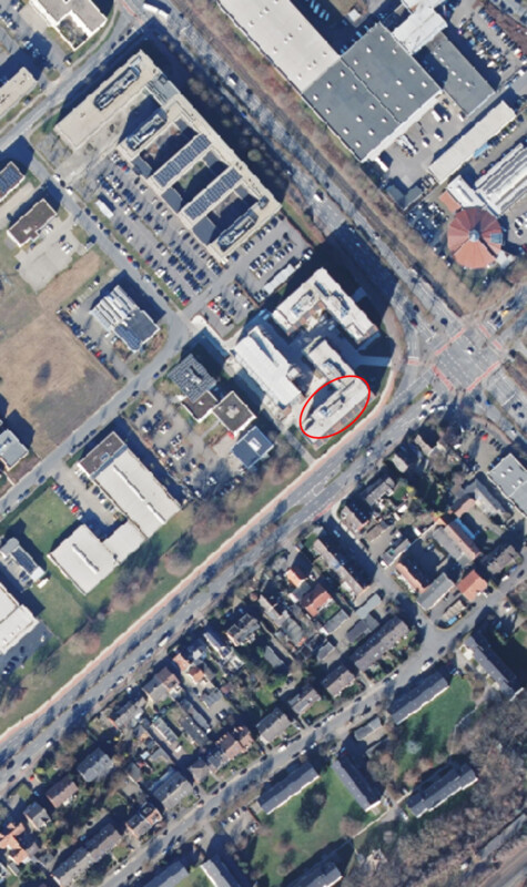 Die Fläche befindet sich im Campus Loddenheide. Hier entstand in hervorragender Sichtlage und mit guter Anbindung an die öffentlichen Verkehrswege ein fünfgeschossiger Bürobau mit Parkhaus.